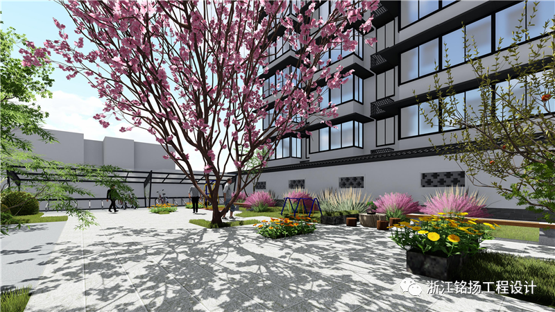 拆除破舊停車棚后,增設了鄰里共享空間,可以供居民在此交流、健身、停留。設計新的非機動車車棚9智能充電樁),并布置在道靠墻位置。